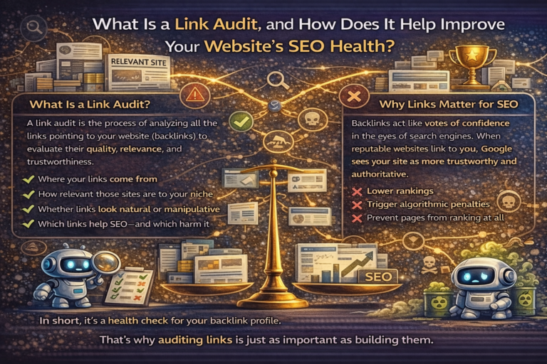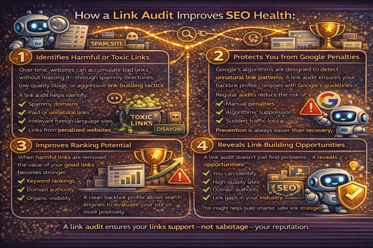By identifying harmful links, protecting against penalties, and uncovering growth opportunities, a link audit helps keep your website’s SEO healthy, trusted, and competitive.